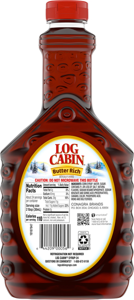 Log Cabin All Natural Syrup, 22 fl oz - Kroger Log Cabin: The Best Traditions Start With the Best Ingredients. Nutritional Information Kosher Non GMO Nutrition Facts servings per container Serving size 2tbsp (30 ml) Amount per serving Calories 110 % Daily value* Total Fat 0g 0% Sodium 10mg 0.43% Total Carbohydrate 26g 9.45% Sugar 20g Protein 0g Calories in Log Cabin Syrup - SparkPeople Log Cabin Syrup (1 cup) Calories: 2, Fat: 0g, Carbs: 1g, Protein: 0g Show full nutrition information Log Cabin Syrup (1 serving) Calories: 210, Fat: 0g, Carbs: 53g, Protein: 0g Show full nutrition information Log Cabin Syrup (1 serving) Calories: 200, Fat: 0g, Carbs: 0g, Protein: 0g Show full nutrition information Log Cabin Syrup (1 serving) Log Cabin Syrup 12oz BTL | Garden Grocer Log Cabin Syrup 12oz BTL. Log Cabin Syrup 12oz BTL. $4.19 ($0.35 / oz) quantity add to cart. ... Nutrition Facts: Serving Size .25 cup. Servings per container 6. Calories . 210. Calories from Fat . N/A ... GardenGrocer.com obtains nutritional information from claims made by the products' manufacturers on labels. We have made every effort to be ...