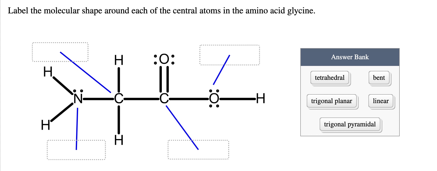 'Label the molecular shape around each of the central atoms in the amino acid glycine., Answcr Bank, tetrahedral, H, trigonal pyramidal, bent, trigonal planar, linear'