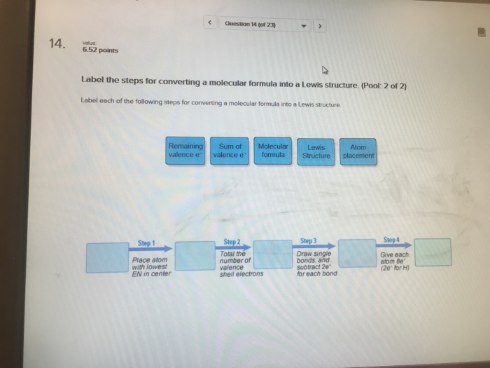 SOLVED:Label each of the following steps for converting molecular ... SOLVED:Label each of the following steps for converting molecular formula into Lewis structure. Atom placement Molecular formula Lewis Structure Step ! Step 2 Total Ihe number of valence snell electrons Step3 Draw sngle bonds and subtract Ze for each bond Stopa Place atom wiln lowest cenler Give each alom 8e (20" @or H)