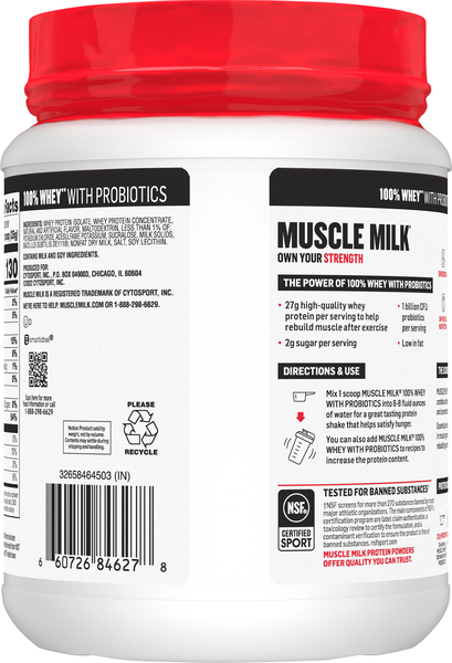 Muscle Milk© MUSCLE MILK® 100% WHEY with Probiotics. Everyday Strength . 27g Protein. 1B CFU Probiot... MUSCLE MILK® ZERO Protein Shake. Active Strength . 20g Protein. Zero Sugar. MUSCLE MILK® Unflavored Powder. Everyday Strength . 25g Protein. 6g Fiber.