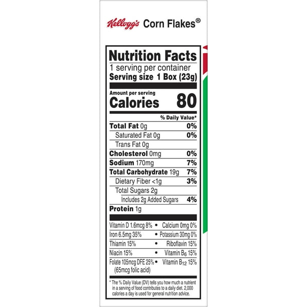 Nutrition Facts for Cereal (Kellogg's Corn Flakes) Cereal (Kellogg's Corn Flakes) · Calories 100 5% DV · Protein 2.1g 4% DV · Carbs 24g 8% DV · Fat 0.1g 0% DV · Fiber 0.9g 3% DV · Sugar 2.7g 5% DV.