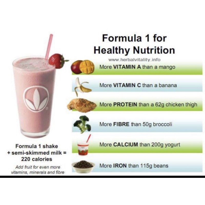Formula 1 Healthy Meal Nutritional Shake Mix ... - Herbalife Nutrition 21 vitamins and minerals 170 calories when prepared as directed 0 cholesterol, 0 trans fats A good source of fiber Excellent source of antioxidant Vitamins A (as beta-carotene), C and E Usage Gently shake the canister prior to each use as contents may settle. Blend or stir 2 scoops with 8 oz. of nonfat milk or soymilk and enjoy!
