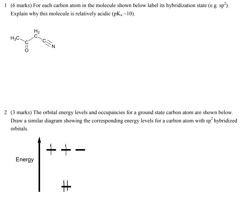 Label the hybridization of each atom noted: hybridization of oxygen ... The hybridization of carbon atom in an alkyne.... what is the hybridization of each carbon atom in acetonitrile... Give the (a) bond order and (b) hybridization state of each carbon atom of carbon monoxide (CO)... bridization, name 3 different compounds that showcase 3 different hybridization variants in the carbon atom. Include ... New questions in Chemistry - Brainly.com Two carbon-carbon single bonds, and eight carbon-hydrogen single bonds. Each of these single bonds is also known as a sigma bond. Every hydrogen atom in this molecule uses an s-orbital to form bonds. Each carbon atom in this molecule forms four sigma bonds. The electrons of each carbon atom are found in one s-orbital and three p-orbitals. OChem Spring 2017 Exam 1 Flashcards | Quizlet Label each carbon atom with the appropriate hybridization (cover bottom) ... Sapling Hw Ch 1.18. a) 120° b) 109.5° Label each carbon atom with its optimum C-C-C bond angle (cover bottom) Sapling Hw Ch 1.19. Rank the following compounds according to increasing positive character of the carbon atom CH₃F What is the hybridization at each of the carbon atoms of the molecule ... The carbon- carbon sigma bond is formed from overlap of an sp3 hybrid orbital on each C atom. ... In sp3 hybridization, the carbon atom is bonded to four other atoms. In this case, 1 s orbital and 3 p orbitals in the same shell of an atom combine to form four new equivalent orbitals. The arrangement of orbitals is tetrahedral with a bond angle ...