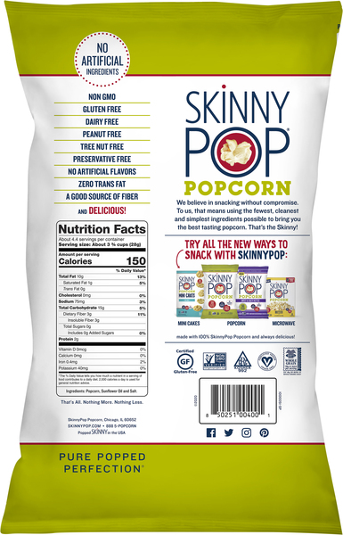 Original Popped Popcorn Popcorn - SkinnyPop A GOOD SOURCE OF FIBER AND DELICIOUS! Ingredients: Popcorn, sunflower oil and salt. ★★★★★ ★★★★★ 3.9 2889 Reviews 2240 out of 2838 (79%) reviewers recommend this product Ï™ Rating Snapshot Select a row below to filter reviews. 5 ★ 1298 4 ★ 690 3 ★ 394 2 ★ 235 1 ★ 272 Average Customer Ratings Overall ★★★★★ ★★★★★ 3.9 Quality 2.8 Value 3.3 Taste 2.9