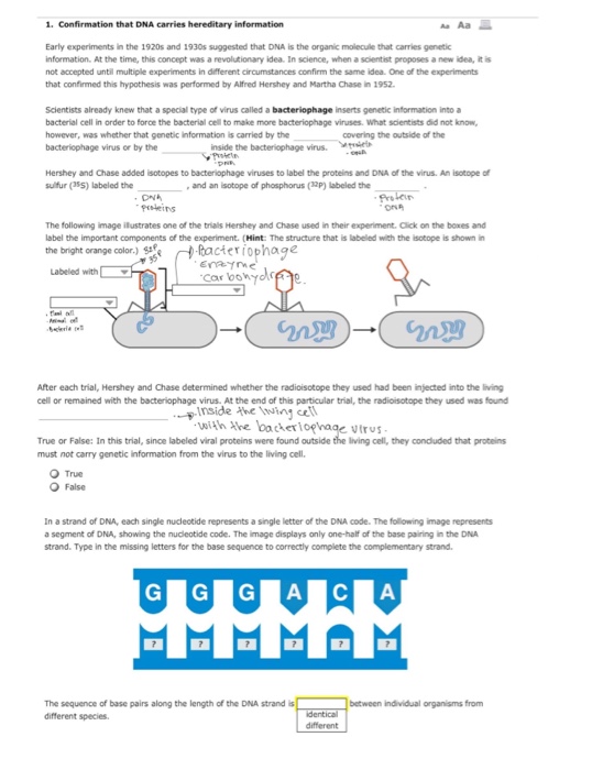 Chapter 10 Reading Guide Flashcards | Quizlet Hershey and Chase found that the phage of DNA entered the host cells but the phage protein did not. Hershey and Chase concluded that the DNA injected by the phage must be the molecule carrying the genetic information that makes the cells produce new viral DNA and protein. What are Chargaff's rules? How did he arrive at them? Chargaff's rules are: In the hershey and chase experiment radioactively-labeled? How did Hershey and Chase differentiate between DNA and protein in the experiment while proving that DNA is the genetic material? Hershey and Chase worked with bacteriophage and E. coli to prove that DNA is the genetic material. They used different radioactive isotopes to label DNA and protein coat of the bacteriophage. ... Hence, it was proved ...