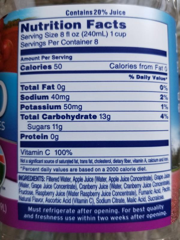 Cranberry juice nutrition label. Ocean Spray Cranberry Juice Nutritional Facts | Healthfully Nutrient Profile Ocean Spray Cranberry Juice Cocktail is cholesterol- and fat-free, and contains very low sodium. An 8-oz. glass boasts 109 calories, with its 28g of carbohydrates coming mainly from sugars—almost 18g per 8-oz. serving. The same serving offers less than 1g of either protein or fiber. Cranberries 101: Nutrition Facts and Health Benefits The main nutrients in 1 cup (100 grams) of raw, unsweetened cranberries are ( 1 ): Calories: 46 Water: 87% Protein: 0.4 grams Carbs: 12.2 grams Sugar: 4 grams Fiber: 4.6 grams Fat: 0.1 grams... Calories in Ocean Spray Diet Cranberry Juice and Nutrition Facts Diet Cranberry Juice Nutrition Facts Serving Size 8 fl oz (240 ml) Amount Per Serving Calories 5 % Daily Values* Total Fat 0.00g 0% Saturated Fat 0.000g 0% Trans Fat 0.000g Polyunsaturated Fat 0.000g Monounsaturated Fat 0.000g Cholesterol 0mg 0% Sodium 40mg 2% Total Carbohydrate 2.00g 1% Dietary Fiber 0.0g 0% Sugars 1.00g Protein 0.00g Vitamin D - Juice Products - Child Nutrition Programs | Food and Nutrition ... - USDA The name of the full strength fruit or vegetable juice as it appears on the label must declare "100 percent juice." B Juice Drink A juice drink is a product resembling juice which contains full-strength juice along with added water and possibly other ingredients such as sweeteners, spices, or flavorings.