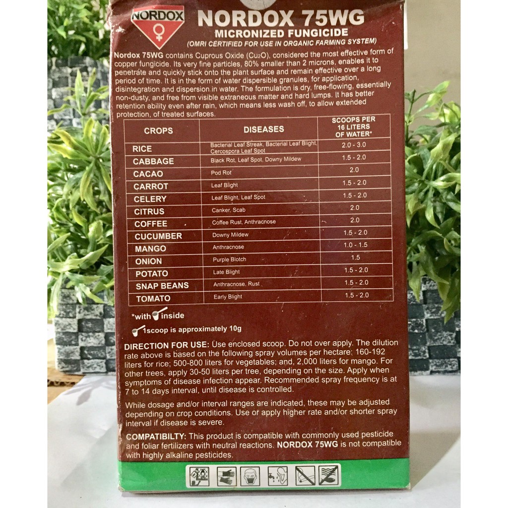 Fungicide- NORDOX 75 WG - Plant Food Company The NORDOX 75 WG Advantage. Superior Quality. •Manufactured from the highest grade copper source available. •Smallest copper particle size on the market for better efficacy. •Stays suspended in spray tank. Reliable, Long Lasting Disease Control. •Highly effective on a wide range of crops. •Superior retention and rain fastness.