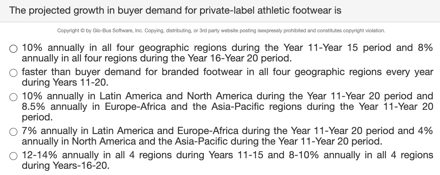 BSG Quiz 1 Flashcards | Quizlet the market for branded athletic footwear is projected to grow 9-11% annually in Latin America and the Asia-Pacific during the Year 11-Year 15 period and 5-7% annually in North America an Europe-Africa during the Year 11-Year 15 period. in Year 11, footwear companies can expect to sell Solved The projected growth in buyer demand for | Chegg.com the projected growth in buyer demand for private-label athletic footwear is 5-7%% annually in all four geographic markets during years 11-15, o 10% annually in north america and latin america during the year 11-year 20 period. 9% annually in europe-africa and the asia-pacific regions during years 11-20. 04-6% annually across all 4 regions during …